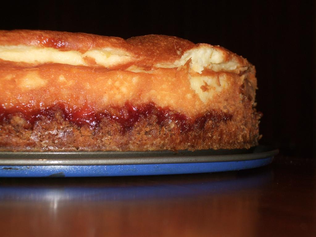 Este paso es opcional, es una de las modificaciones que he realizado en la receta. Se trata de poner la mermelada en el interior de la tarta en lugar de ponerla sobre ella. Lo que conseguimos es que el sabor de la mermelada se mezcle con la base y el dulzor se suaviza un poco. Extendemos una capa de mermelada sobre la base. La mermelada típica es la arándanos o la de fresa.