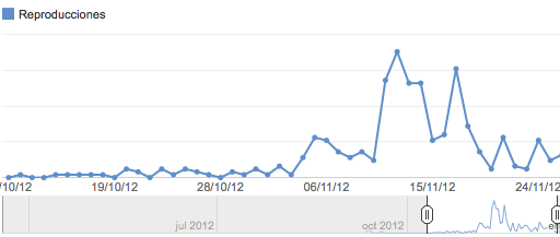 Los primeros días de Noviembre se observa un gran crecimiento en las visitas que coincide con las primeras emisiones del anuncio de televisión de Apple. Durante esos días incluyo las nuevas palabras clave. Entorno al día 10 de Noviembre se observa un crecimiento desproporcionado de visitas que, según mis conclusiones, es cuando Youtube vuelve a rastrear mi vídeo y lo indexa con los nuevos textos.